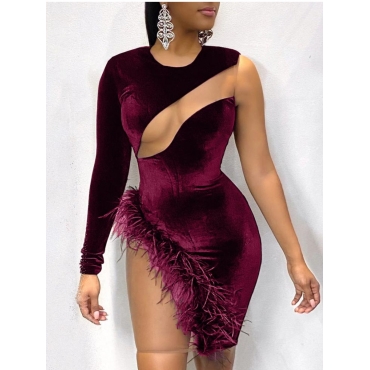 Lovely Sexy One Shoulder Patchwork Wine Red Mini Dress