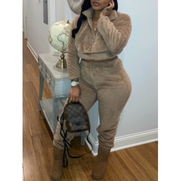 Lovely Casual Turndown Collar Zipper Design Brown Two Piece Pants Set