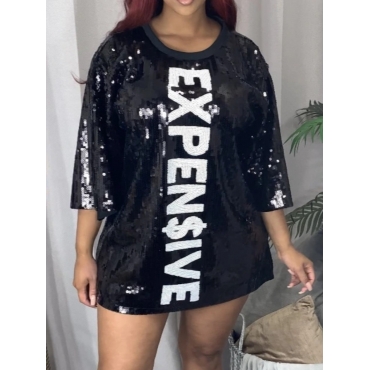 Lovely Street O Neck Letter Sequined Black Mini Dress