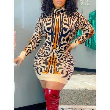 Lovely Stylish Turtleneck Leopard Print Mini Plus Size Dress