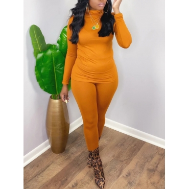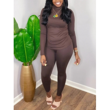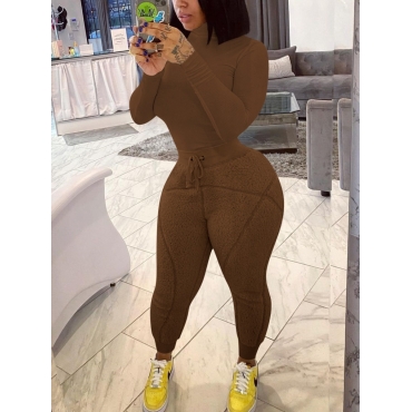 Lovely Casual Turtleneck Long Sleeve Coffee Two Piece Pants Set(Without Necklace)