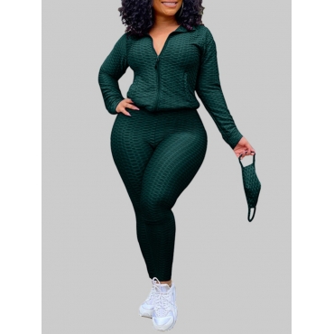 Lovely Casual Turndown Collar Zipper Design Black Green Plus Size Two-piece Pants Set