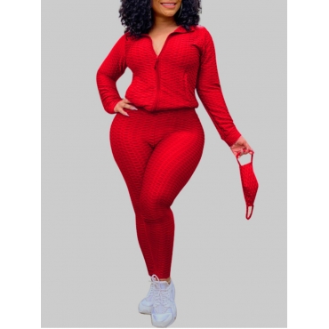 Lovely Casual Turndown Collar Zipper Design Red Plus Size Two-piece Pants Set