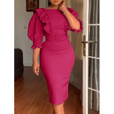 Lovely Stylish O Neck Flounce Design Rose Knee Length Dress