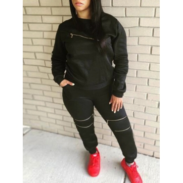 Lovely Leisure O Neck Zipper Design Black Two Piece Pants Set