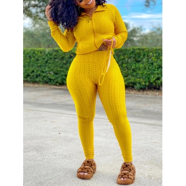 Lovely Casual Turndown Collar Zipper Design Light Yellow Plus Size Two-piece Pants Set