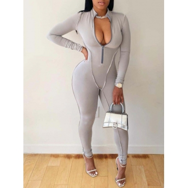 Lovely Sportswear Zipper Design Patchwork Grey One-piece Jumpsuit
