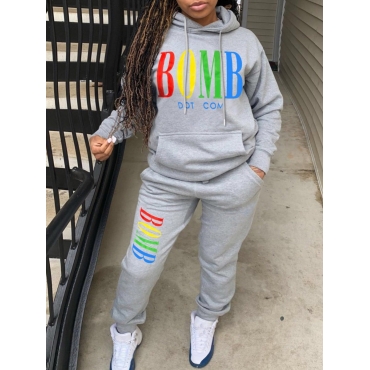 Lovely Leisure Hooded Collar Letter Print Grey Two Piece Pants Set
