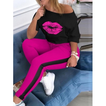 Lovely Casual O Neck Lip Print Rose Red Plus Size Two-piece Pants Set