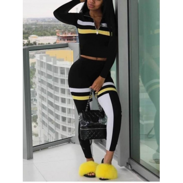 Lovely Sportswear Turndown Collar Patchwork Black Two Piece Pants Set