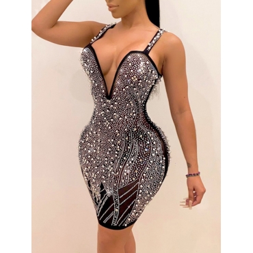 Lovely Sexy Spaghetti Strap Hot Drilling Decorative Black Knee Length Dress