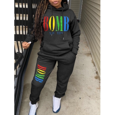 Lovely Leisure Hooded Collar Letter Print Black Two Piece Pants Set