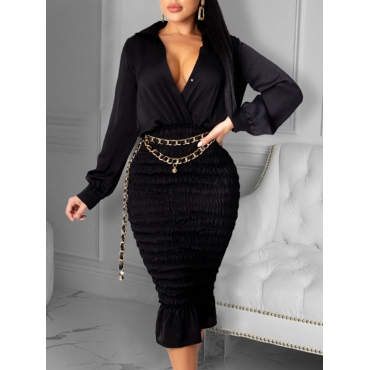 Lovely Trendy Turndown Collar Fold Design Black Mid Calf Dress