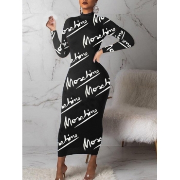 Lovely Trendy Half A Turtleneck Letter Print Black Ankle Length Dress