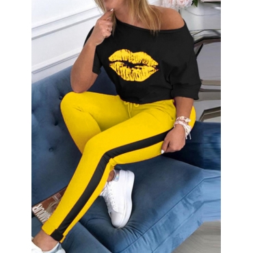 Lovely Casual Lip Print Patchwork Yellow Two Piece Pants Set