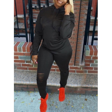 Lovely Casual Hooded Collar Zipper Design Broken Holes Black Two Piece Pants Set