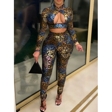 Lovely Sexy Print Hollow-out Gold Two Piece Pants Set