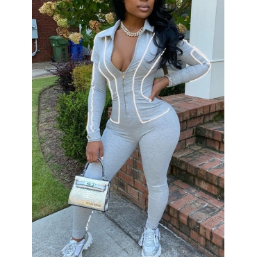 Lovely Sportswear Turndown Collar Patchwork Light Grey One-piece Jumpsuit