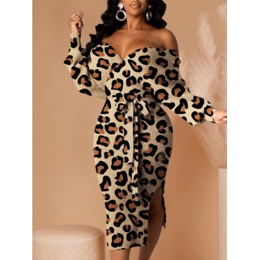 Lovely Trendy Dew Shoulder Leopard Print Brown Mid Calf Dress
