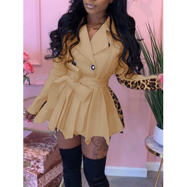Lovely Trendy Turndown Collar Leopard Print Patchwork Khaki Mini Dress