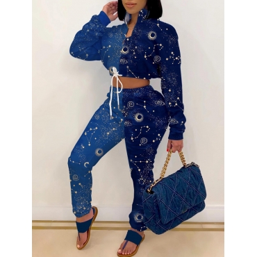 Lovely Stylish Turndown Collar Print Blue Two Piece Pants Set