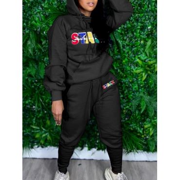 Lovely Sportswear Hooded Collar Letter Print Black Two Piece Pants Set