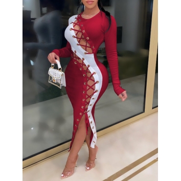 Lovely Sexy Patchwork Bandage Design Red Ankle Length Dress