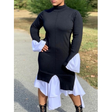 Lovely Stylish Turtleneck Patchwork Black Mid Calf Dress