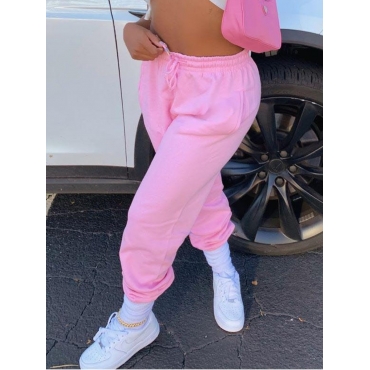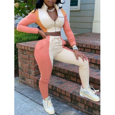 Lovely Casual Mandarin Collar Letter Patchwork Pink Two Piece Pants Set