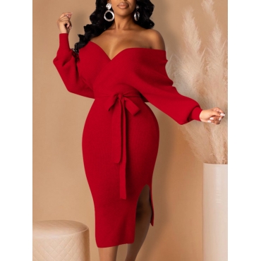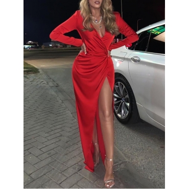 Lovely Trendy V Neck Side High Slit Red Maxi Dress