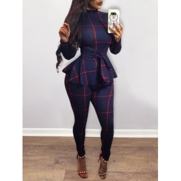 Lovely Stylish Half A Turtleneck Grid Print Blue One-piece Jumpsuit