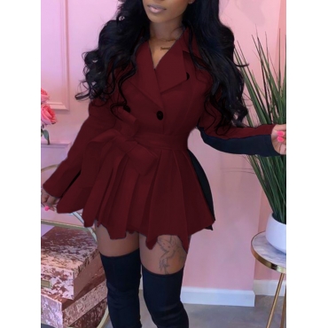 Lovely Trendy Turndown Collar Patchwork Fold Design Wine Red Mini Dress
