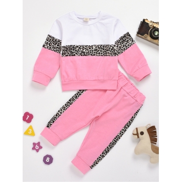 Lovely Sportswear O Neck Leopard Print Patchwork Pink Girl Two-piece Pants Set