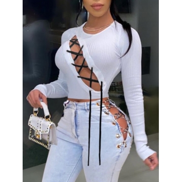 Lovely Sexy O Neck Bandage Design White T-shirt