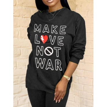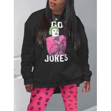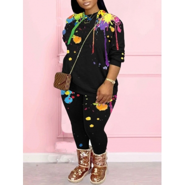 Lovely Casual O Neck Print Black Plus Size Two-piece Pants Set