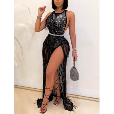Lovely Sexy Backless Tassel Design Black Maxi Dress