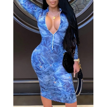 Lovely Trendy Print Zipper Design Blue Knee Length Dress