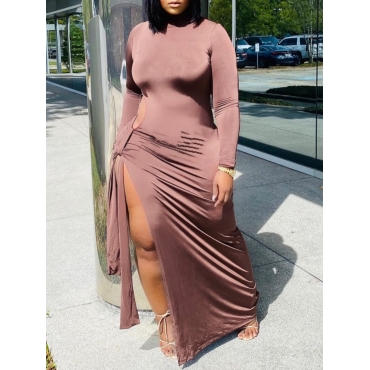 Lovely Casual Turtleneck Side High Slit Coffee Ankle Length Dress