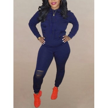 Lovely Casual Hooded Collar Zipper Design Broken Holes Deep Blue Two Piece Pants Set