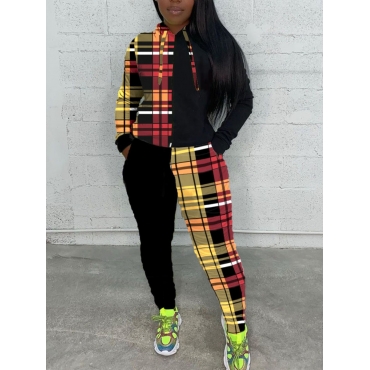 Lovely Leisure Hooded Collar Grid Print Multicolor Two Piece Pants Set(Batch Grid Print)