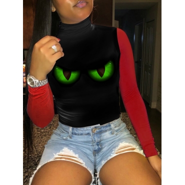 Lovely Stylish Turtleneck Print Patchwork Black T-shirt
