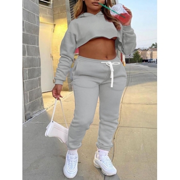 Lovely Casual Hooded Collar Crop Top Grey Two Piece Pants Set