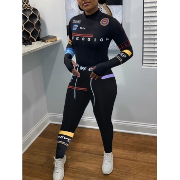 Lovely Sportswear Turtleneck Letter Print Black Two Piece Pants Set