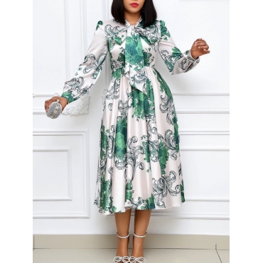 Lovely Trendy Print Fold Design White Mid Calf Dress