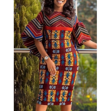 Lovely Trendy O Neck Print Patchwork Red Knee Length Dress