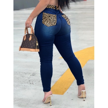 Lovely Trendy Leopard Prnt Patchwork Skinny Deep Blue Jeans