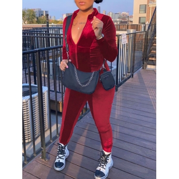 Lovely Sportswear Mandarin Collar Zipper Design Skinny Wine Red One-piece Jumpsuit