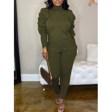 Lovely Stylish Turtleneck Fold Design Army Green Two Piece Pants Set