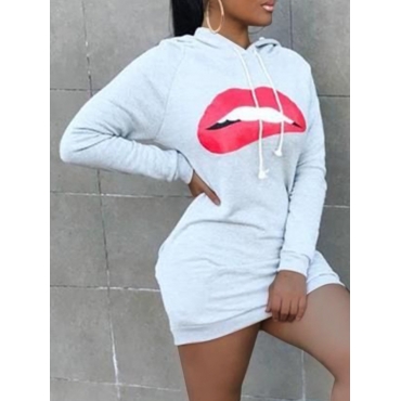 Lovely Leisure Hooded Collar Lip Print Light Grey Mini Dress