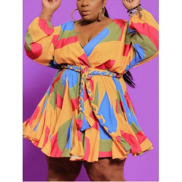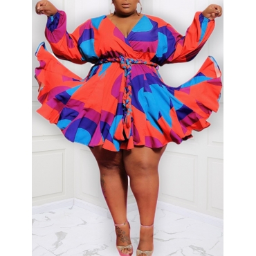 Lovely Trendy V Neck Patchwork Orange Mini Plus Size Dress
